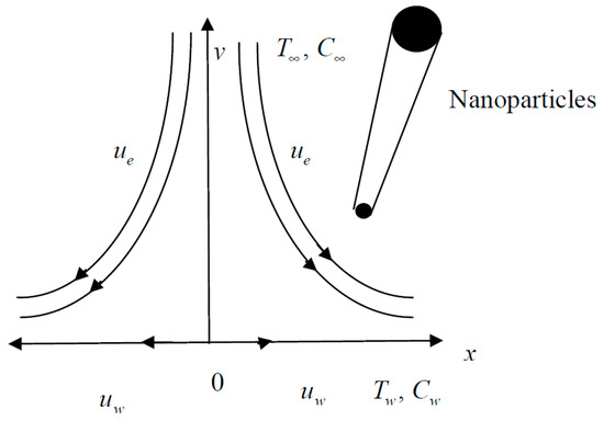 The Hiemenz flow pattern, including its employment in the monitoring of flows over submarine tips, ship tips, and aeroplanes, occupies a crucial role in the exploration of many industrial and natural phenomena. It is also essential in various of fields, including hydrodynamic processes, electronic fan cooling, and nuclear device freezing, to name a few. The optimum values of the aforementioned phenomena were provided by Ariel [15]. Motsa et al. [16] numerically ascertained the Maxwell fluid outcomes for two-dimensional Hiemenz flow on the way to a diminishing sheet. Parand et al. [17] assessed the Hiemenz flow with heat transfer through a porous medium of an incompressible non-Newtonian Rivlin–Ericksen fluid.