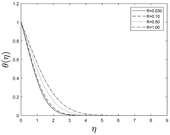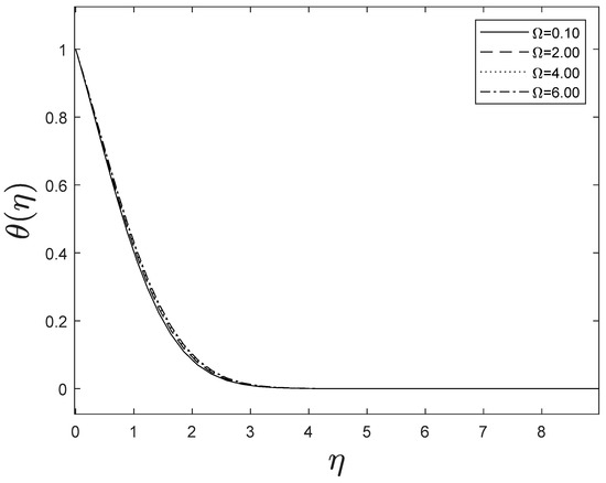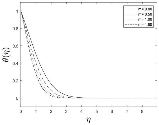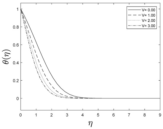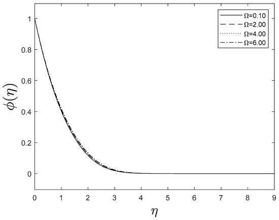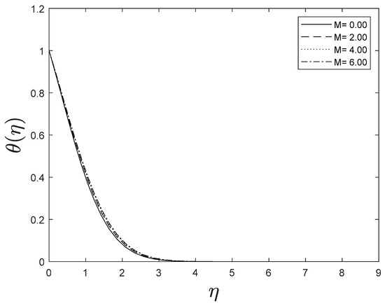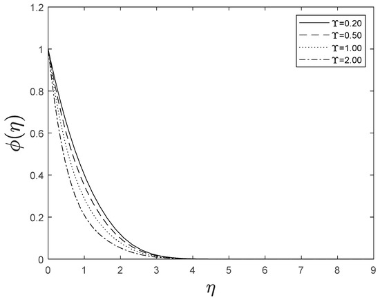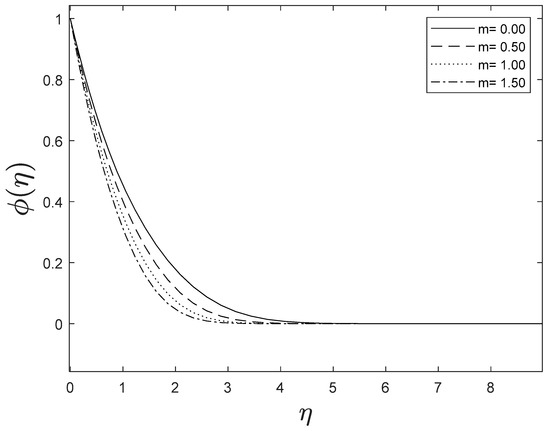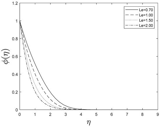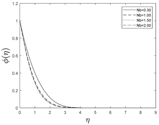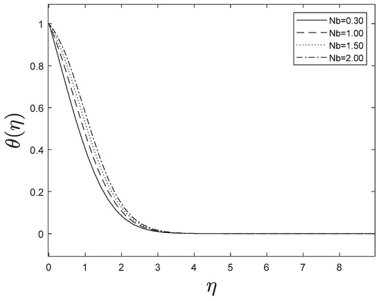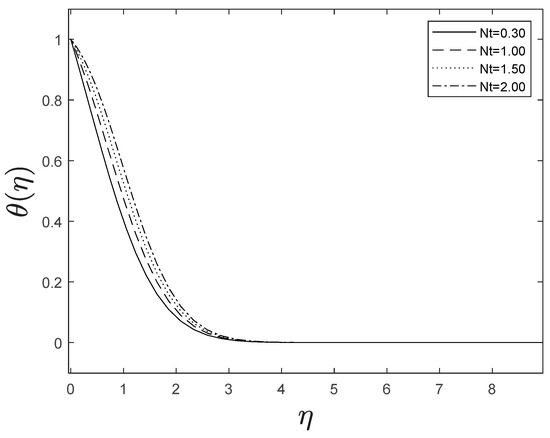 The inclusion of nanoparticles externally allowed the thermophoresis parameters to appear. The inclusion of nanoparticles is correlated to the thermal conductivity of liquids. When the amplitude of is improved, the thermal conductivity of the fluid boosts, and this greater thermal conductivity leads to a high temperature. We also identified that relatively high values result in greater nanoparticle concentrations. This is shown in Figure 13 and Figure 14.