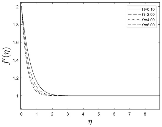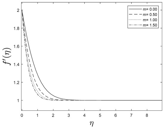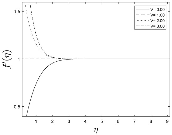 where prime denotes differentiation with respect to , is the velocity ratio parameter, reflects that the plate is progressing in the identical manner as the free stream velocity, implies that the plate is heading in the contrary side of the free stream, and stands for static plate. The case designates that the plate’s mobility is slower than that of the free-flowing fluid and designates that the mobility is greater. is the case when the plate and the fluid proceed at the same velocity.