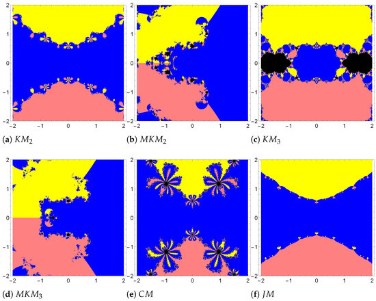 The concept of the basin of attraction confirms the convergence of all the possible roots of the nonlinear equation within a specified rectangular region. So, here, we present the convergence of ordinary King’s methods (), multiplicative King’s methods (), Chun method (), and Jnawali method () on different initial values in the rectangular region by dynamical planes explained in [37]. In this section, we have tested three problems to analyze the basin of attraction for solving nonlinear equations. Each image is plotted by an initial guess as an ordered pair of 256 complex points of abscissa and coordinate axis. If an initial point does not converge to the root, then it is plotted with black color; otherwise, different colors are used to represent different roots with tolerance .
