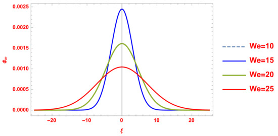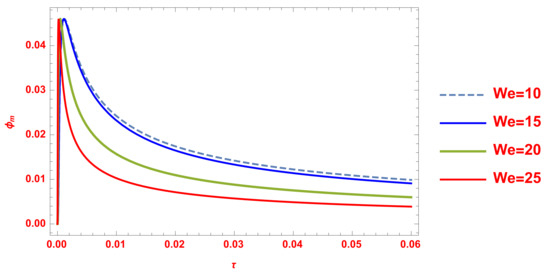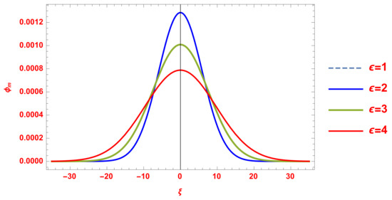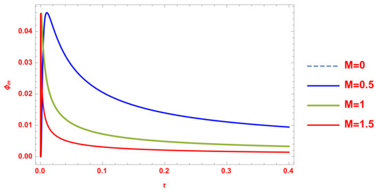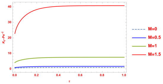 The diffusion coefficient was calculated using the mean concentration from Equation (46). Figure 6, Figure 7, Figure 8 and Figure 9 show the impacts of on the concentration profile varying along for a fixed time . It is evident that the peak in mean concentration decreases as M, , , and increase. It is symmetrical and bell-shaped at the origin. In the presence of Hartmann number and electric number, the Lorentz force, a resisting force created by the effects of a transverse magnetic field on an electrically conducting fluid, reduces the fluid’s velocity and thickens the velocity and concentration boundary layer. The fluid concentration falls as a result of this. The presence of porous media decreases the velocity and concentration. We can see that the transfer of essential metabolites such as sugar and amino acids is quite sluggish, and convective transfer accelerates them from a medical perspective in biomechanics by means of mean concentration. As a result, the cells in the deep zone may receive fewer nutrients.