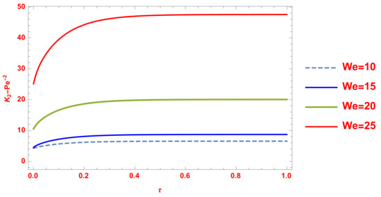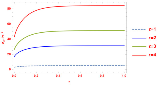 Figure 2, Figure 3, Figure 4 and Figure 5 elucidate the results of Equation (37), when used to calculate the dispersion coefficient with time, as well as the various impacts of the Hartmann and electric numbers, and the viscoelastic and porous parameters. According to Equation (37), for are insignificant in comparison to and can be ignored. Equation (37) represents the unstable diffusion equation with a time-dependent . This figure shows that, for fixed values of , and , the dispersion coefficient increases as increases, and becomes free for large . These figures demonstrate that the increases with certain parameters, such as M, , , and . The viscosity of the plasma of diabetics is greater than that of non-diabetics, often resulting in a higher diffusion coefficient for diabetic patients. The findings of this study are identical to the results of Alshehri and Sharma [1] on dispersing solutes.