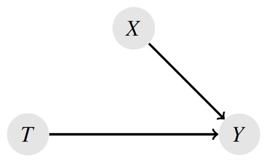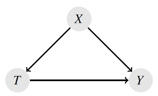 In observational studies, bias due to confounding occurs when both the outcome Y and the treatment T are caused by a common parent X [13], shown in the directed acyclic graph (DAG) in Figure 1. An example of confounding is where students are assigned (or self-select) an intervention (T), say extra videos or tutorials, based on their current grades (X), which also affect the outcome (Y). The problem is that T possesses inherent bias that does not result in the true ATE when applying Equation (1). The phenomenon seen in Figure 1 is also known as the backdoor path, where association from T to Y is not only direct but via X (the backdoor).