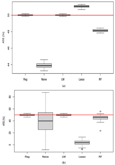 Figure 3 presents results for where the ground truth treatment effect = 50, for both linear and non-linear simulations. The horizontal red lines in all the subsequent figures refer to . In the linear data simulations, the traditional regression model, Reg, and the X-Learner linear model (LM) performed accurately whereas Naive, Lasso, and RF did not have any overlap in their distributions. Therefore, none of those mentioned had any estimations that equaled the true ATE. Naive appears to have performed the worst which is not surprising since it computed the difference between the mean treatment and control groups which contain bias.