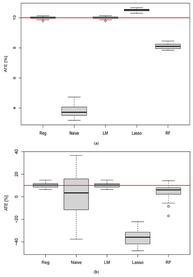 Box plots of the ATE estimations for the five methods where = 10. (a) linear. (b) non-linear.