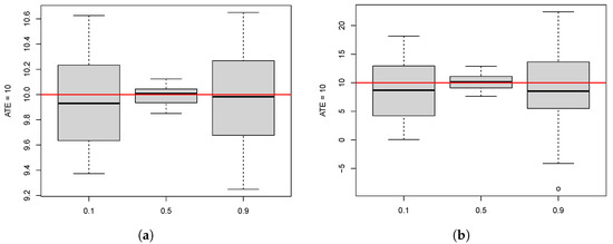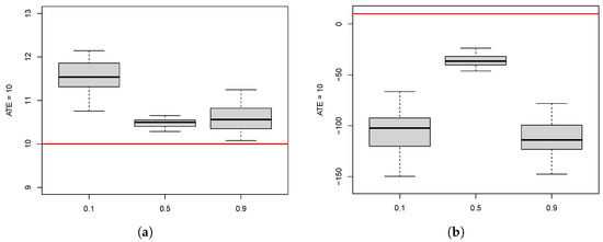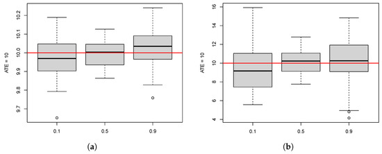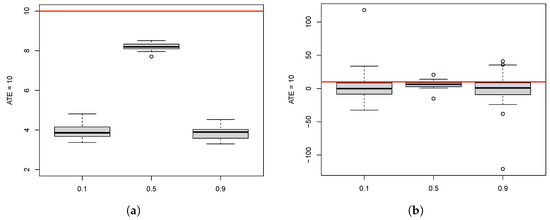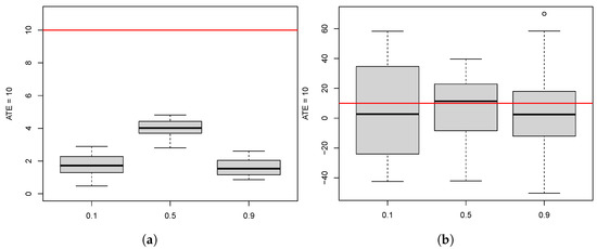 A further aim was to study a range of true ATE values. was varied as follows: [50, 10, 1]. The aim of varying as shown was to determine if large treatment effects (50) would affect the method differently to smaller ones (10, 1).