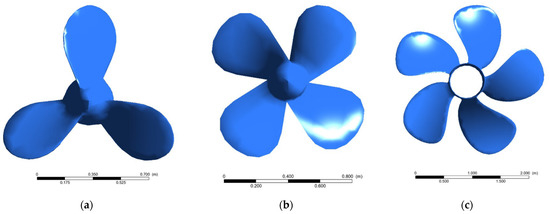 Topology of fixed-screw-angle marine propellers: (a) 3 blades; (b) 4 blades; and (c) 5 blades.