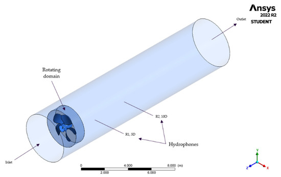 Figure 2 shows the observer positions where the hydrophones are located to capture sound pressure were placed at distances 5D and 10D at an axial direction to the propeller. It is the distance from where noise is emitted (propeller) to where the observer receive the noise [27]. This approach was chosen to determine how each propeller type would significantly contribute to a noise signature. The observer positions are not far out in the field but relatively close to the rotating frame. It is assumed that noise would dissipate further downstream.
