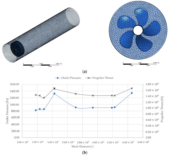 A mesh created using a tetrahedron and seven inflation layers with a first thickness of 10-5 and a wall plus value of y+ = 5 are shown in Figure 3a. There is a 510,000-element maximum limit on the student version of ANSYS® Fluent 2022 R2. It archived 422,660 elements and meshed almost to the limit. Based on the restrictions of the commercial code, these components were accepted as being appropriate for the model. However, a mesh sensitivity study was conducted using ANSYS Workbench Parameterization module (See Appendix A). The element size was varied (progressively reduced) as the cell-mesh size enlarged and are show in Figure 3b. The outlet pressure and the propeller thrust were selected to as quantities that characterize the mean flow These quantities were compared to the cell-meshes until they could not change any more, especially, within the limits of the software.