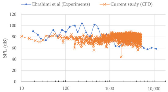 It should be noted that these results only consider the effects of the far-field FW–H equation for the analysis of the cavitation tunnel and do not consider the effects of the computational domain’s reflection. As a result, the results of the numerical SPL’s equation, verified in Figure 4, can be used as free-field results. However, a cavitation tunnel is a completely reverberant environment, and wall reflections impact the propeller’s overall noise performance [33].