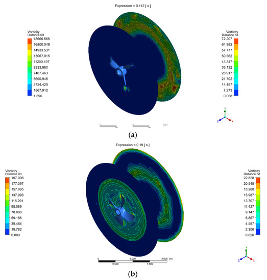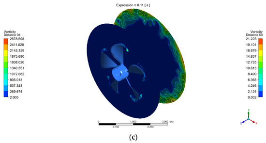 The planes on 0d and 5d are situated near the sheet cavity, and the tip-vortex region is shown separately in Figure 5a–c, representing the blades being studied. The plane on the 0d distance depicts the tip vortex on the blade; it is seen that there is a larger vorticity magnitude (18,666.566 1/s) on the tips from the three blades, and it is undoubtedly less on a five-blade propeller (2678.698 1/s). The four-blade propeller exhibits very low magnitudes (197.980 1/s) that, when coupled with the vortex structure’s dynamic behaviors driven by cavitation, the vapor volume fraction testifies to the point that cavitation has a significant impact on the vorticity distribution and its transport.