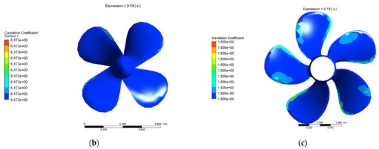 The wake’s presence significantly impacts the propellers’ cavitation and noise performance. The tip-vortex cavitation and leading-edge suction-side sheet cavitation are present and can be used to predict radiated noise levels. This can be performed for all propeller geometries. The results, therefore, are shown in Figure 6.