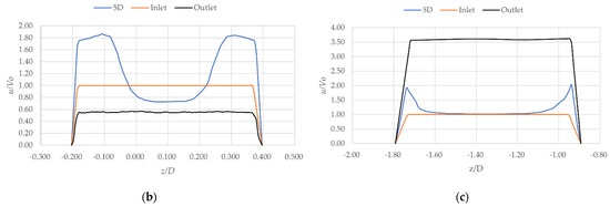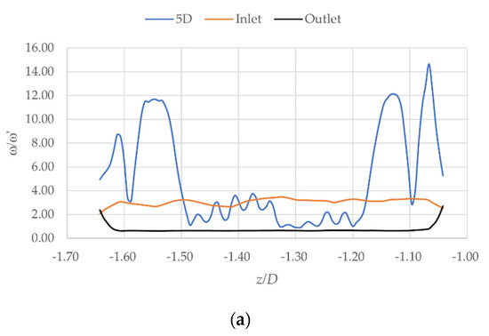 The streamwise velocity fluctuation Vth, normalized by the inlet velocity V0 and u is the velocity in the x-direction, is shown in Figure 7. The low-velocity core with the maximum peak velocities on either side of the jet centerline is present at the 5D stream of the propeller and is typically symmetrical. The three-blade propeller exhibits very high-velocity peaks. The four- and five-blade propellers decrease as the number of blades increases. The velocity profiles of the inlet and outlet for all blade cases are normal distributions of velocity flow for a turbulent flow. Where z is the axial distance and D is the diameter of the rotating domain. A note is made that the main flow domain was not rotating but only the rotating domain where propellers have their various impressions.