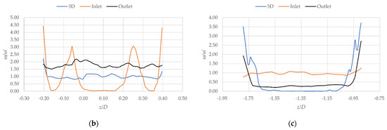 Streamwise velocity profiles of a multiple frame reference (5th frame) at time 0.112 s: (a) three blades, (b) four blades, and (c) five blades.