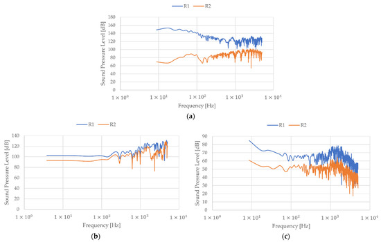 Two hydrophones (receivers R1 and R2) are used in the numerical study, and their positions are shown in Figure 2, with their results for the three propellers presented in Figure 9. The reference level in the solid body is considered a source of the sound where the blade surfaces.