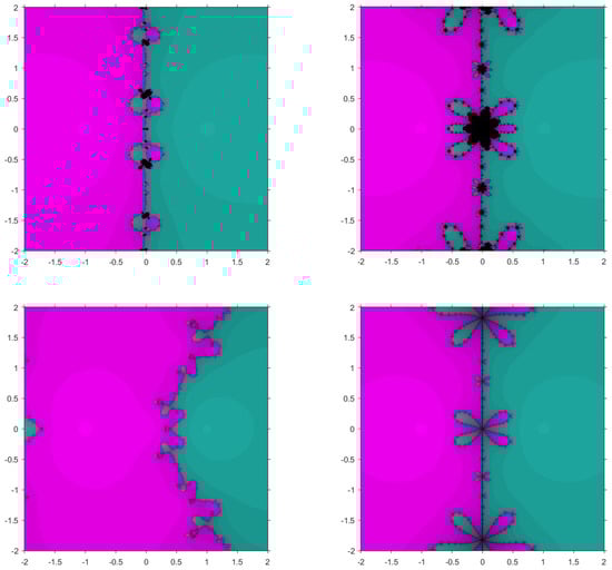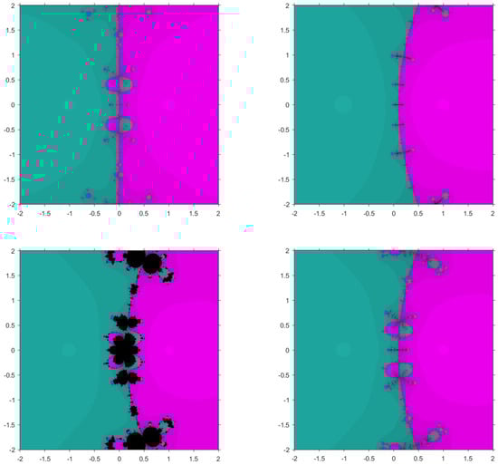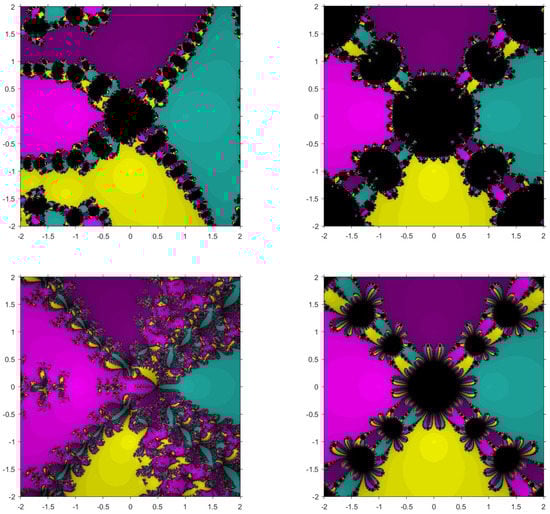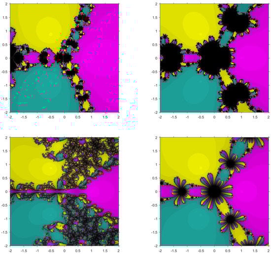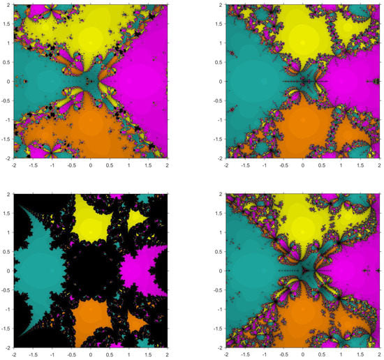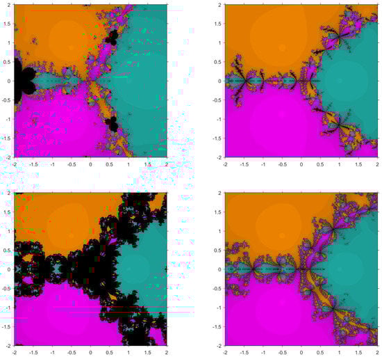 On this front, we take a  grid of the rectangle . A colour is assigned to each point  on the basis of the convergence of the corresponding method starting from  to the simple root and if the method diverges, a black colour is assigned to that point. Thus, distinct colours are assigned to the distinct roots of the corresponding problem. It was decided that an initial point  converges to a root  when . Then, point  is said to belong to the basins of attraction of . Likewise, the method beginning from the initial point  is said to diverge if no root is located in a maximum of 25 iterations. We have used MATLAB R2022a software [] to draw the presented basins of attraction.