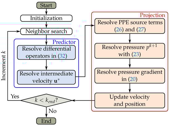 To integrate the semi-discretized system, a projection-based scheme like incompressible SPH (ISPH) [] is followed. Specifically, each time step is split into an update and projection step. The update step considers the viscous momentum diffusion, body force, and surface tension updates. For the update step, we have
