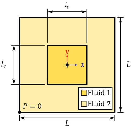 Verification of the surface tension resolution followed the same procedure as that presented in []. The case was constructed by initializing a primary fluid inside a cube with sides of a length m. An external fluid filled the volume between the primary fluid and a larger cube with sides of a length m. A no-slip condition was enforced on all boundary surfaces. A pointwise zero-pressure condition was enforced at , uniquely defining the pressure field. A schematic description of the system is shown in Figure 2.