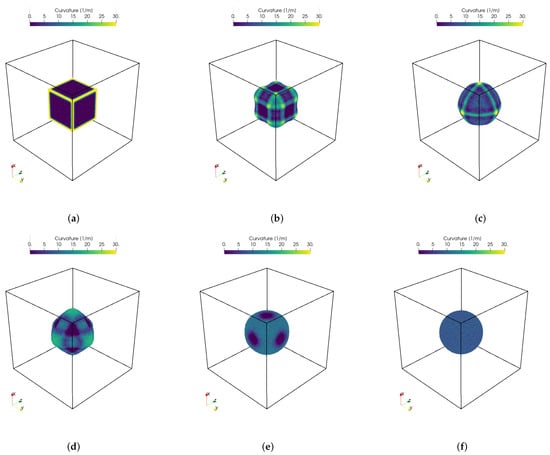 Figure 3 shows snapshots of the droplet for . As expected, the regions with higher curvature were driven such that the curvature essentially diffused over the surface. The viscosity dampened the flow to produce subsequently smoother interfaces until a spherical droplet was obtained.
