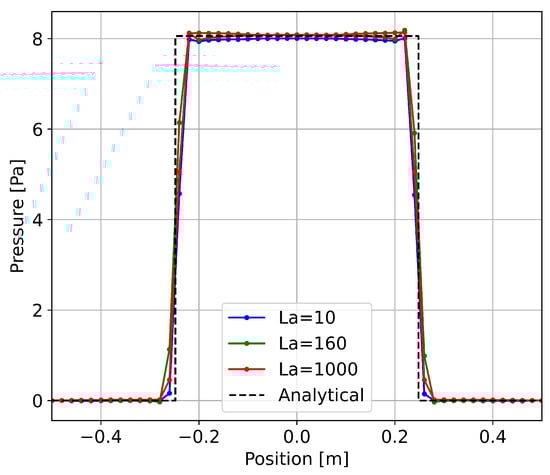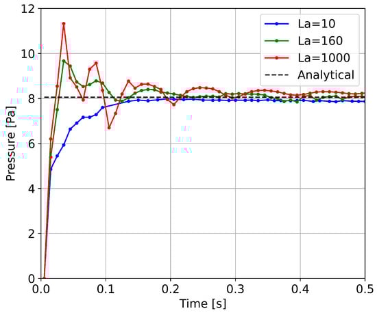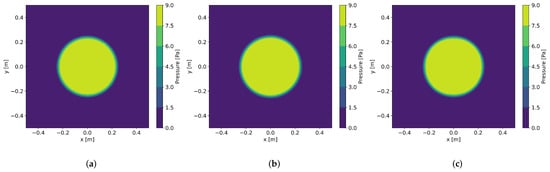 Figure 4a–c shows the mid-plane pressure field at time s for all three cases. When matching the analytical solution’s prediction, the pressure field is uniform over the spherical droplet. Figure 5 shows the evolution of the averaged pressure difference between the two phases for the three cases. As expected, the relaxation time increased with a decrease in viscosity. However, since the droplet volume and surface tension coefficient were fixed over the simulations, each case oscillated around . The steady state pressure along the centerline in the x direction is presented in Figure 6. The integrated error for , , and was 2.23%, 1.64%, and 1.56%, respectively. As highlighted by Figure 6, this error was mainly due to the pressure discontinuity being resolved by the CSF over a finite width.
