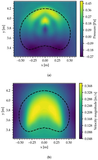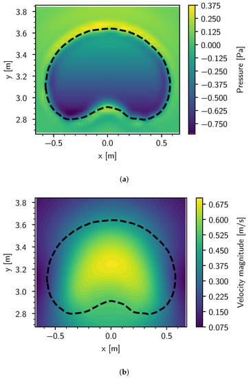 As with Case 1, the steady state pressure and velocity fields around the bubble can be seen in Figure 11a,b, respectively. The effects of the high-density ratio were especially prevalent in the pressure field. While the pressure difference across the bubble was similar to the low density ratio case, a significant pressure jump over the interface can be seen. This led to the bubble pressure being lower than the external pressure field.