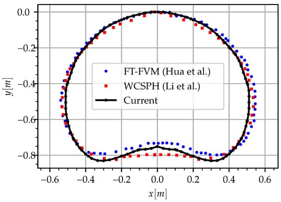 Figure 9 compares the steady state bubble shape to the results of both [,]. A qualitatively good agreement between both shapes was observed. However, it can be noticed that both the FVM and WCSPH results predicted slightly wider bubbles at 1.09 m and 1.07 m, respectively, compared with the current method’s predicted width of 1.03 m. Interestingly, although the trailing surface lied between the FVM and WCSPH results, this scheme predicted a shape with pronounced lobes on the trailing surface similar to that of the FVM results.