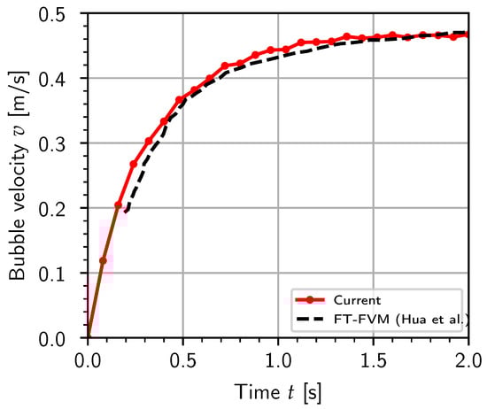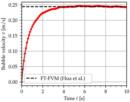 The evolution of the bubble’s vertical velocity was compared to the results of Hua et al. []. These results can be seen in Figure 12. A good correlation between the results was obtained, but it was found that the bubble accelerated slightly faster early in the simulation. Slight fluctuations in the vertical velocity can also be seen before the bubble settled into its steady state condition.