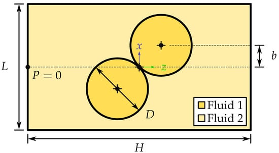 The geometry shown in Figure 13 is used in all cases. Two droplets, each with a diameter m, were initialized with an offset of m away from the cylindrical domain’s centerline. The length of the cylinder was set to , and the diameter was given by . Full-slip conditions were applied to all domain surfaces. The droplets were initialized with a relative velocity of .