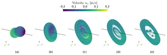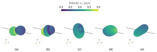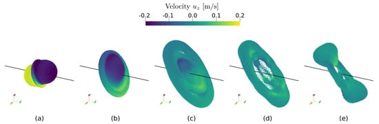 The 3D evolution of the droplet particles can be seen in Figure 14, Figure 15 and Figure 16. These results are colored by their z-velocities, with the black line indicating the cylinder centerline. Qualitatively distinct behavior was observed between the systems. Specifically, the large surface tension of the low We case was sufficient to prevent fluid separation after the droplets coalesced. As a result, the net angular momentum of the system resulted in the combined droplet rotating about the system’s center. Large deformations in the interface were observed initially but were soon dampened out by viscous effects.