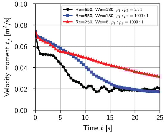 The low density ratio case lost energy much faster than the high density ratio case. This was expected since, in the low density ratio case, the droplets acted against an external fluid of a similar density, as opposed to the high density ratio case, where the droplets carried most of the system’s energy. Fluctuations in the velocity moment can be seen between s and s for the low density ratio case. This coincided with the rupture of the film structure and the formation of the internal torus.