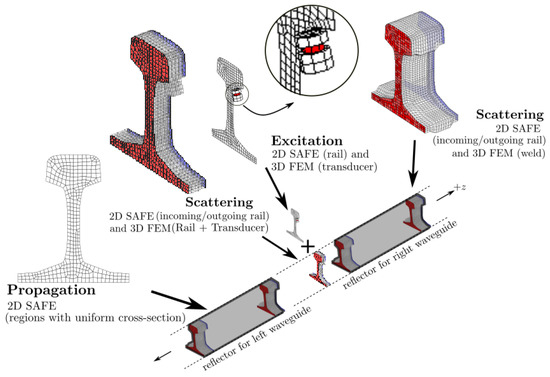 The method of Baronian et al. [32] is further employed according to Ramatlo et al. [19] to create a model for the entire section of rail considered. To account for the computation of reverberating reflections, a scattering model of the transducer is included. The model was implemented by using a hybrid model combining the 3D FEM of the rail and the transducer with two SAFE models of the rail to represent the incoming and outgoing waveguides. The hybrid model was then used to predict the wave modes reflecting and transmitting through the transducer when an incident wave interacted with the transducer attached to the rail. The models of excitation and scattering from the transducer are thus coupled with models of the left and right waveguides, and the wave modes are propagated between these domains. Response signals are calculated at the transducer location in the frequency domain based on the specified number of modes: