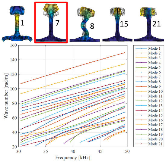 In GWU, the waveguide structure supports an infinite number of propagating modes. These modes propagate as a function of frequency. The frequency at which a mode starts to propagate is known as the cut-off frequency. Figure 3 shows the dispersion curves of propagative modes supported by the UIC60 rail considered. Several mode shapes associated with some of these modes are also plotted. The mode numbering scheme used in this paper is similar to that in reference [22]. When we excite the rail track in the head section as explained in Section 2, the mode that will be strongly excited is the mode with energy concentrated in the head of the rail. Such a mode will be referred to as mode number 7. Other modes of propagation will also be excited by the transducer, though their contribution to the total response will not be as large as that of mode 7. Examples of such modes are mode numbers 8, 15 and 21. An example of a mode that will not be excited by the transducer is mode number 1. The displacement of this mode is mainly in the web section along the longitudinal axis of the rail.
