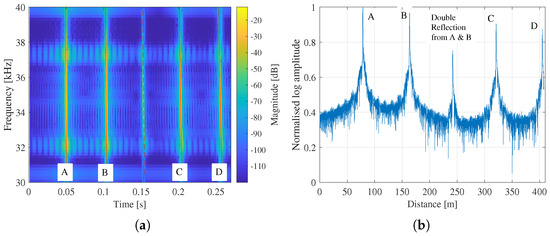 (a) Spectrogram of the simulated baseline signal (mode 7 only) and (b) the equivalent distance domain signal.