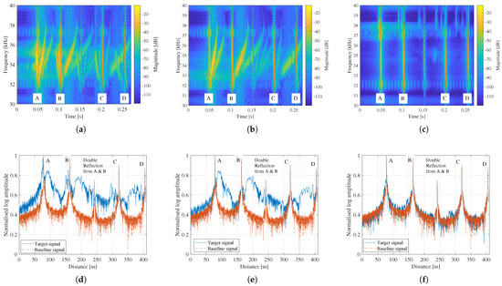 Spectrograms and the equivalent distance domain signals, for example, target signals with different mode combinations. (a,d) Modes {7, 8, 15, 16, 21, 22}, (b,e) Modes {7, 15, 16} and (c,f) Modes {7, 8, 9, 23, 24}.