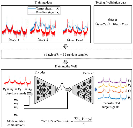 Given a set of 820 baseline signals containing the contribution of mode 7 only, each denoted by vectors where is the length of the signal and a specified combination of modes; we want to train the VAE to fuse additional modes to each baseline signal. The distance domain baseline signals in Figure 4 form the main inputs for our VAE. The second meaningful inputs are the mode numbers corresponding to the modes that should be included in the response. The VAE should be trained to approximate the target signals with complexity introduced according to the combinations of modes given by vectors . A batch size of randomly selected samples was used for each training step. The VAE is trained by minimizing the reconstruction loss, which is the mean absolute error (MAE) between the original target and the approximation ,