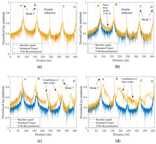 First, we notice that the VAE was able to capture the complex features in the reflected signals. For the rail set-up considered in this paper, the most dominant mode excited by the piezoelectric transducer is the least dispersive mode with energy concentrated in the head of the rail (mode 7), shown in Figure 3. This mode was used to compensate for dispersion according to the procedure in [18]. Hence, the mode is identified as a sharp peak in each reflection group. Other modes with energy in the head of the rail contribute to the response signals, as explained in detail in reference [22]. Some of these modes exist individually, while others exist as coupled modes. These modes were not perfectly compensated for dispersion. Hence, their energies are spread out. In Figure 7a–d, it is evident that the reflections from welds in the VAE reconstructed responses are comparable to the finite-element-simulated virtual experiment target. Furthermore, the VAE was able to reconstruct the double reflection located at ∼240 m, resulting from the reverberation of mode 7 between welds A and B, as shown in Figure 7. In Figure 7a, the original target and reconstructed result show that the specified modes, modes 9 and 11, did not have a significant contribution to the overall response. In Figure 7b, the contribution of modes 15 and 23 to the overall response was also insignificant. These modes resulted in noise between the reflections from welds A and B. Figure 7c,d illustrate a case where the reflections caused by additional modes are significant and overlap with other reflections.
