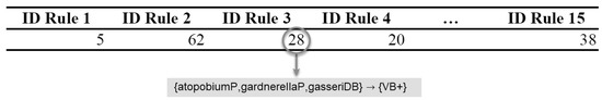 - Encoding scheme: An individual of the population is a subset of R association rules each identified with an ID number. Figure 1 shows an example of this codification from 1 at 15 rules by ID rule.In this work, the value of R is set to 1 to 15 since in [18] authors obtained five rules with a biological significance which were determined by a human expert, so the 15 tests ensure the algorithm will find this minimal set of rules.