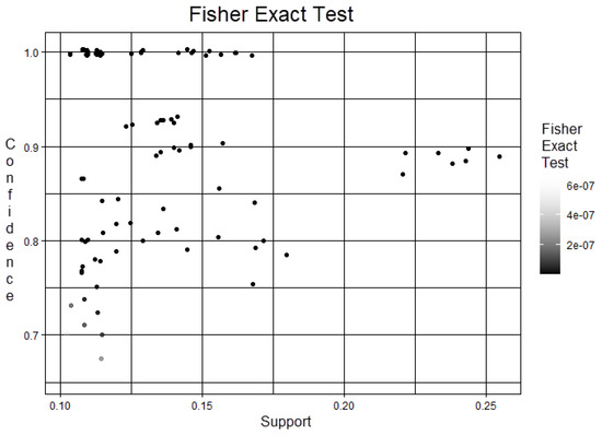 The next part of the experiment was the analysis of the quality metrics, which evaluate the association rules generated by the Apriori algorithm. Since this study focused on the rules that had as a consequent VB+, which represents one element as a consequent, the metrics Fishers Exact Test (Figure 2), Hyperlift (Figure 3), Lift (Figure 4), and Confidence (Figure 5) were evaluated using scatter plots that allow us to visualize their range of data, maximum, and minimum values. The comparison between the graphs shows that the lowest value range is for the Fishers Exact Test metric (Figure 2), followed by Confidence. In the study that metrics are used in DE the very low value ranges do not favor the evolutionary process.