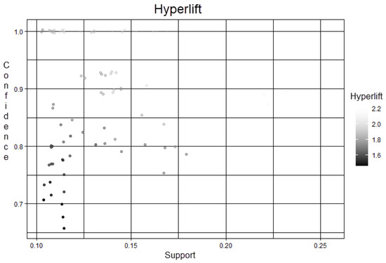 The scatter plots also show that the highest ranges of values were for the Lift (Figure 4) and Hyperlift metrics (Figure 3).