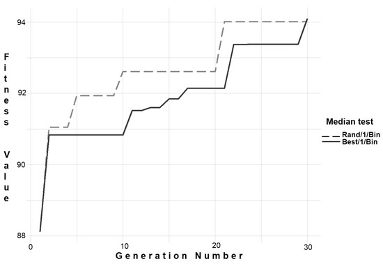 Table 3 shows the results of 30 independent runs with the two DE variants included in this study (rand/1/bin and best/1/bin). The best results for both versions were when D = 15, the best fitness value in the rand/1/bin version is 96.4201 on test number 14, and for the best/1/bin version is 95.6184 on test 6.