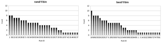 The 5 most frequent rules of the 15 tests for the rand/1/bin variant by ID are 1, 58, 21, 62, and 19. For the variant, the best/1/bin by ID are 19, 58, 62, and 83. The details for both variants are shown in Figure 7.