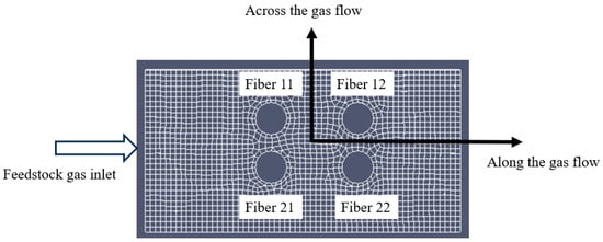 The size of the fibers’ domain was much smaller compared to the length of the reactor. The end effect of the fibers can be neglected because the fiber length was much larger than the fibers’ diameter. The side surfaces of the DSMC domain were taken as symmetrical boundaries to account for the fact that the bundle structure was self-repeating.