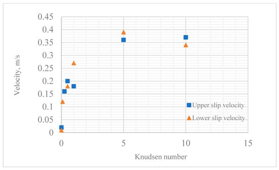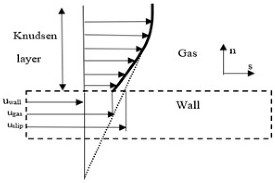 In the frame of the partial slip flow approach, 0.01 < Kn < 0.1, the continuum approximation is still valid apart from the Knudsen layer [26]; see Figure 2. To account for the rarefaction feature at the wall, special boundary conditions are considered that are associated with the velocity slip, named Maxwell’s boundary condition [27,28].