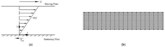 To model the Couette flow, a DSMC simulation domain was created (see Figure 3b). The number of cells along the flow direction (horizontal) was 20 and the number of cells along the height was 20. The length-to-height ratio of each cell was 5. The simulation time step was chosen in such a way that each DSMC particle would stay for at least three time steps in a single cell during the simulation. Here, the time step was chosen as 2.96 × 10−11 s and the number of time steps was 1000. If Kn = 0.001, the flow could be assumed to be a continuum. The pressure was 4.89 × 10−6 Pa and the number density of gas was 1.19 × 1027 (see Table 1). The value of Kn = 0.01 is a transitional Knudsen number, beyond which the gas flow starts to deviate from continuum approximation. In Table 1, the number density of gas and the corresponding pressure are listed for all the Knudsen numbers.