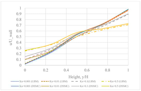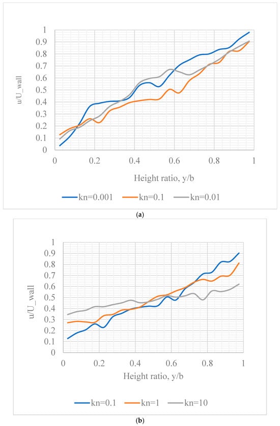 As shown in Figure 4a,b, the Couette flow velocity profile was obtained for the range of Knudsen numbers corresponding to a different degree of rarefaction. The flow with Kn > 0.01 represents partial slip flow, in which the velocity at the lower wall is small but not equal to zero. When increasing of the value of the Knudsen number, flow became more rarefied and near the bottom rigid surface the fluid velocity started to increase. In Figure 4a, for Kn = 0.001, the flow velocity at the lower wall was 0.05 times the upper-plate velocity, while for Kn = 0.1, the ratio increased to 0.12. In Figure 4b, for Kn = 1, the wall fluid velocity was 0.28 times the upper plate velocity and for Kn = 10, where the flow was quite rarefied, the wall fluid velocity was 0.32 times the upper plate velocity.
