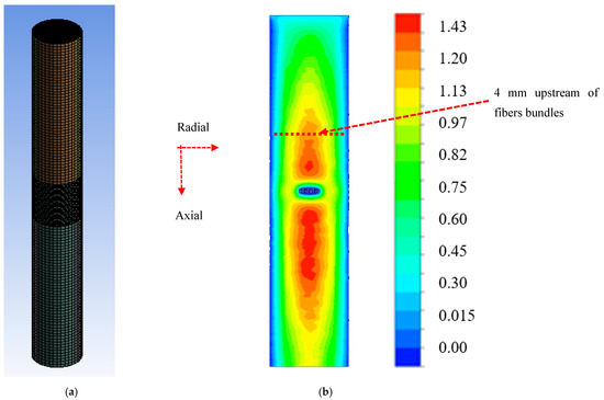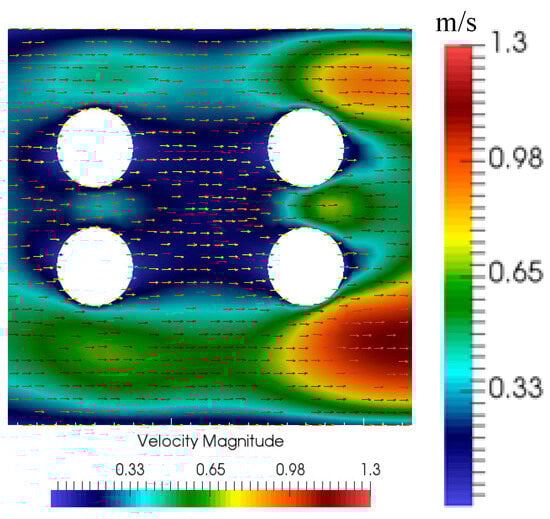 Figure 8 shows that in the interior of the array of fibers in a bundle, the fluid velocity magnitude was smaller, ~0.33 m/s, compared to the inlet velocity of ~0.97 m/s. Between two fibers, the velocity increased due to the partial blockage of the flow area following the conservation of mass.