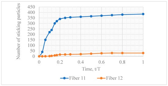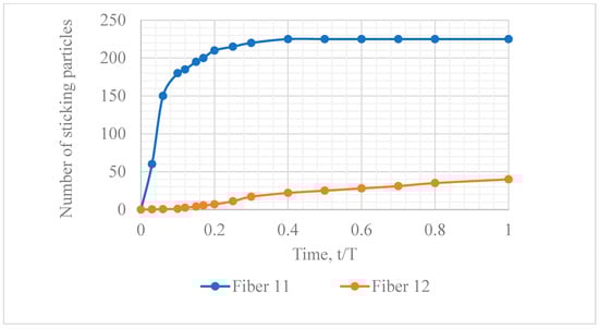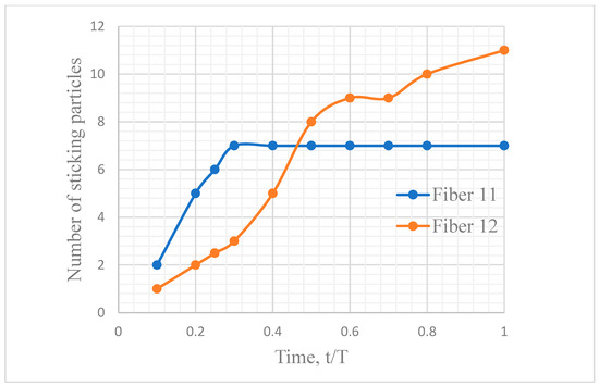 For case 1, by time moment t/T = 0.25~360, simulated particles were deposited at the fibers’ surface (see Figure 13), while for case 2 with the same 20% volume fraction, at t/T = 0.40, 200, simulated particles were deposited. It shows that the smaller distance between the fibers and smaller diameter of fibers causes ~1.63 times larger deposition for front-column fibers. For the second-column fibers, the magnitude of deposition becomes reversed. Due to the higher distance, fibers of 0.5 µm diameter and 1 µm distance have 1.5 times larger deposition than a 0.25 µm diameter and 0.5 µm distance. Figure 13 and Figure 14 show that, compared with front fibers, a rear fiber accumulates particles at a slower rate over a longer time interval.