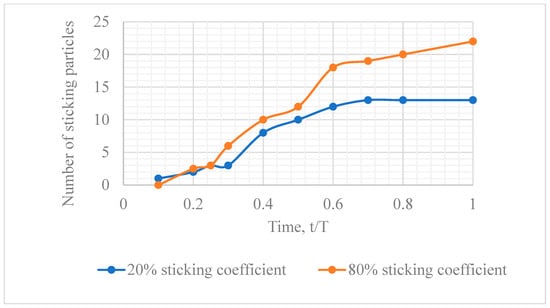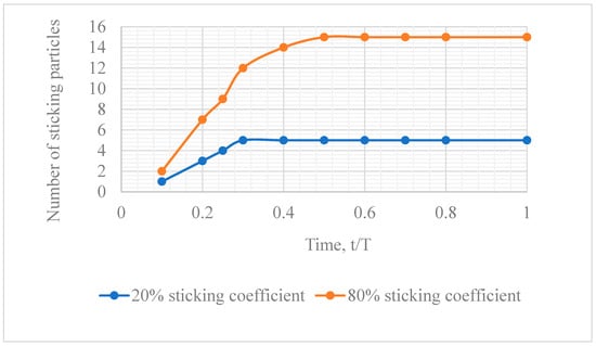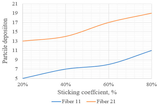 In the previous section, simulations were conducted with the sticking coefficient equal to 50%. To understand the role of the value of the sticking coefficient, a parametric study is conducted in the current section for a range of sticking coefficients, namely, 20%, 40%, 50%, 60% and 80%. With a higher value of the sticking coefficient, particles would have a higher probability of sticking to the fiber surface, while a lower probability of sticking repels more particles away from the fiber surface. The simulations conducted in the current section quantify the trend.