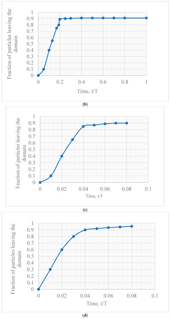 The fraction of particles leaving the domain in flow across the set of fibers for sticking coefficient equal to 50% for the range of Knudsen numbers: (a) area of influence around the bundle of fibers; (b) no-slip condition; (c) Kn = 0.3 and (d) Kn = 0.5. The considered time interval T = 10 µs.