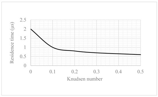 Figure 16 shows that with the increase in the Knudsen number, the residence time decreased nearly linearly for Kn > 0.1. The residence time was defined as such that 90% of particles had left the domain. For smaller Knudsen numbers including the continuum zone (Kn = 0.001), the residence time was close to 2 µs (see also Figure 15b). In terms of physical significance, with a smaller fiber size, the residence time would be smaller due to the slip velocity at wall, which would offer less time for surface reactions. With less time available for surface reaction, and the smaller surface area available for deposition, the CVD process, which is a relatively slow process itself, would produce less solid deposition in the substrate surface.